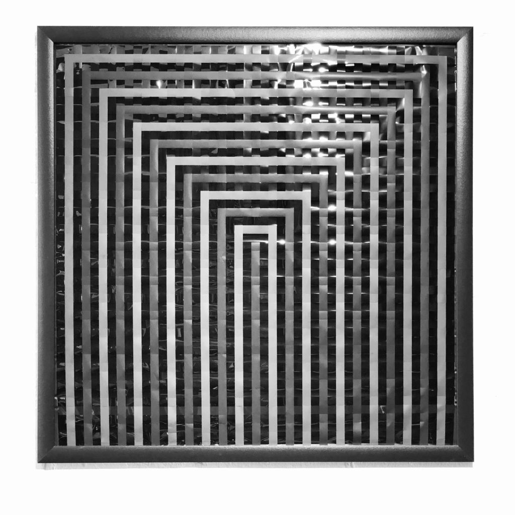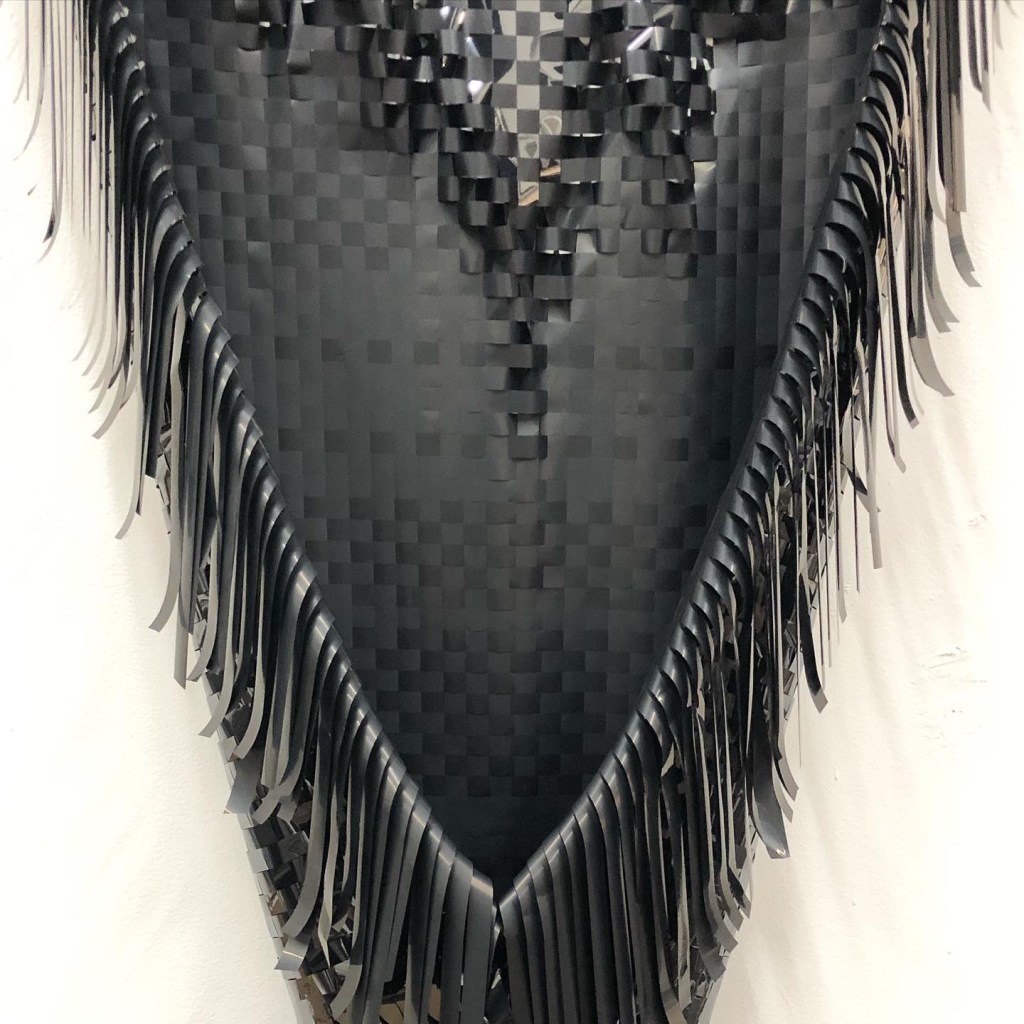The VHS ribbons have been removed from their cases and interlaced as textiles and abstractions of conversations about women and war. The ribbons conceal a diary of conflict re-organized into patterns that sometimes unravel at the edges. The final tapestries display invisible narratives further distorted by intersections and reflections.